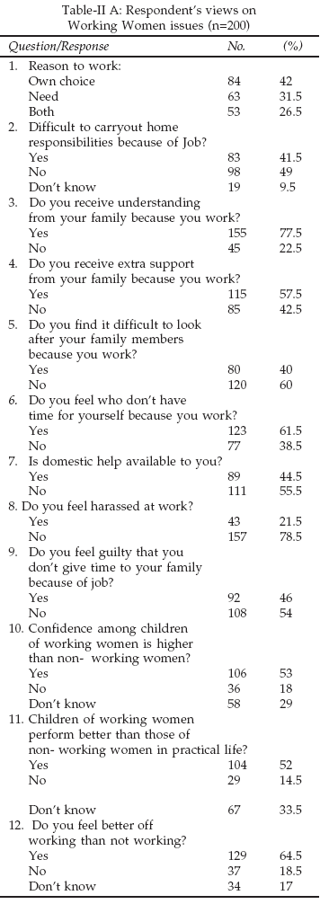 One hundred twenty three (61.5%) women felt they did not have enough time for themselves. Domestic help was available to eighty nine (44.5%) women and forty three (21.5%) felt harassed at work. Ninety two (46%) women felt guilty because they were unable to give time to their family because of work [Table-II-A]. Confidence among children of working women was higher than non-working women according to 106 (53%) respondents. Children of working women perform better than those of non-working women in practical life according to 104 (52%) women. One hundred twenty nine (64.5%) women felt better working than not working [Table-II-A].