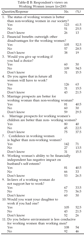 The status of working women is better than non-working women according to 123 (61.5%) respondents. Financial benefits outweigh other disadvantages according to 105 (52.5%) respondents. Sixty (30%) respondents would give up work if they had a choice. One hundred twenty six (63%) respondents agree all women in future will have to work. Marriage prospects of working women and their children are better than non-working women and their children according to 81 (40.5%) & 80(40%) respondents respectively. Confidence in working women is higher than non-working women according to 142 (71%) respondents. Eighty one (40.5%) respondents feel that working women’s financial independence has negative impact on theirs husband’s self esteem. [Table-II-B].