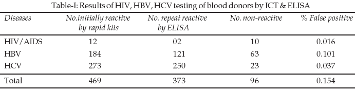 Results: Out of a total of 62090 voluntary blood donors, 469 donors were found to be initially reactive for either HIV, HBV or HCV. Amongst these 96(0.15%) blood donors were found to have tested falsely positive for HIV, HBV or HCV as compared to testing by ELISA.