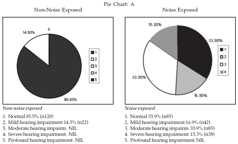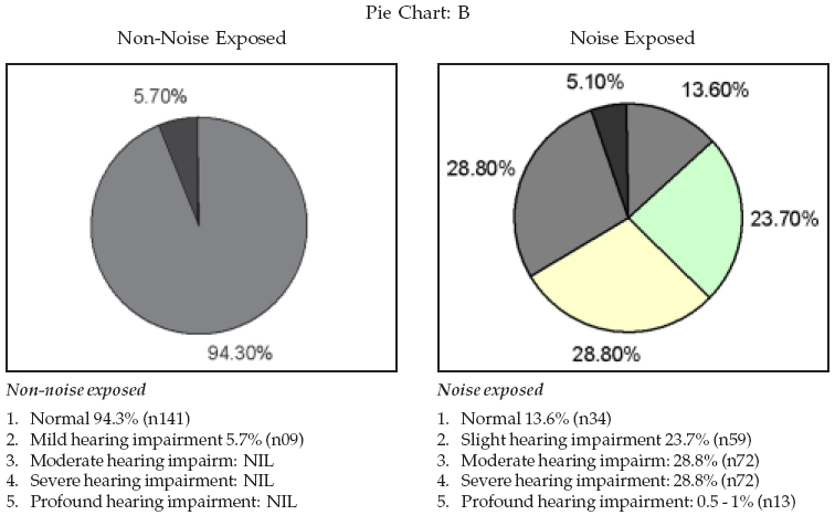 This included metabolic disorder like Diabetes Mellitus, family history of deafness, history of Ototoxic drugs, history of high grade fever, Hypertension, having Oto scopic signs of middle ear disease or current symptoms of ear disease. Subjects who showed an apparent hearing loss, hearing threshold level exceeding 25dB at any test frequency on the base line audiogram i.e. level of hearing taken prior to employment and exposure to noise. Females and age below 23 and above 59 years were also not included in the study. A final sample of 250 noise exposed and 150 non-noise exposed subjects were included in the study.Measures to conduct study were: