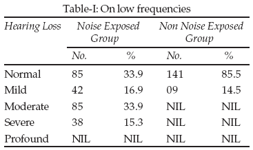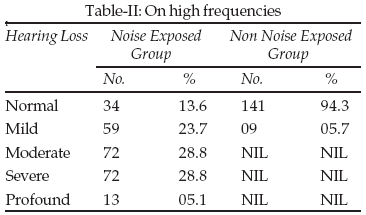Results: A significant difference in prevalence of hearing loss (more than 30db) between the noise exposed and non noise exposed group (P <0.5) was noted.