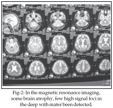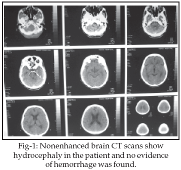 In the primary brain CT no lesion was seen but some days later hydrocephaly has been detected. In brain magnetic resonance imaging (MRI), some brain atrophy and few high signal foci in the deep white matters of both brain hemisphere was reported. There was not any S.O.L in the supra and infra tentorial structures.