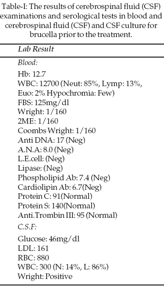 Results of laboratory examination is shown in Table-I. In blood sample leucocytosis (85% neut), positive Wright and Coombs Wright was seen. C.S.F was Wright positive. The platelet count, BUN, Cr, Cholesterol, T.G, Uric Acid, Na, K, PTT, PT, U/A, vasculitis tests and echocardiography were normal.