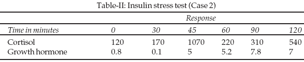7 was stage two and Pubic hair stage three. Her cardiovascular system examination was essentially normal. She had biochemical evidence of hypogonadism. An insulin stress test revealed no abnormalities in cortisol and growth hormone response.Case 3: