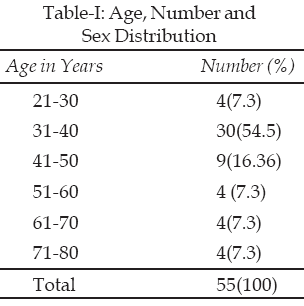 Fifty five patients were included in the study. All the patients were females with various degrees of euthyroid diffuse or nodular goitres for which they had subtotal thyroidectomy. Thirty (54.5%) of the patients were within the age range of 31-40 years (Table-I) The mean operating time was 52 ± 15.3mins. The mean weight of the glands was 80 ± 19 grams. Two patients had malignant goitres and were referred to other centre’s for further management.