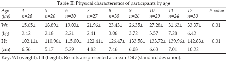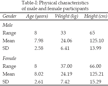 Table-I shows physical characteristics of male and female partcipants. Results showed that there was a significant difference in weight and height across the 9 age levels (p<0.05) (Table-II).