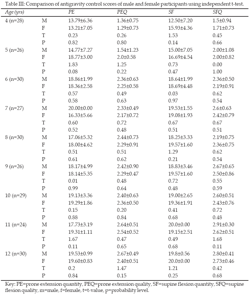 There was no significant difference in quantitative and qualitative antigravity control test scores between male and female participants in each age level (P>0.05). Table-III