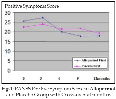 There was no significant difference in the positive symptoms mean score in the group starting on placebo at the first phase and after cross-over to allopurinol (p>0.05). one year after the end of the study, positive symptoms mean score in this group had no significant difference with beginning of the study, sixth month, and twelfth month (p>0.05).