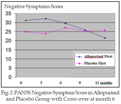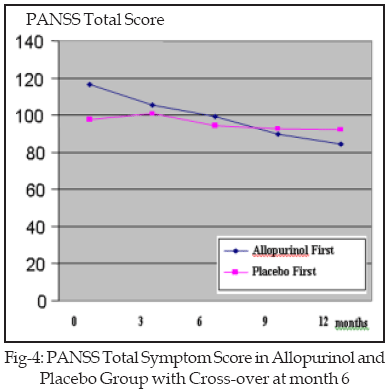 After cross-over, the PANSS mean scores decreased in both allopurinol and placebo treatments but it wasn’t statistically significant. Other studies had shown a significant decrease in PANSS mean scores especially for positive and general symptoms in allopurinol treatment.