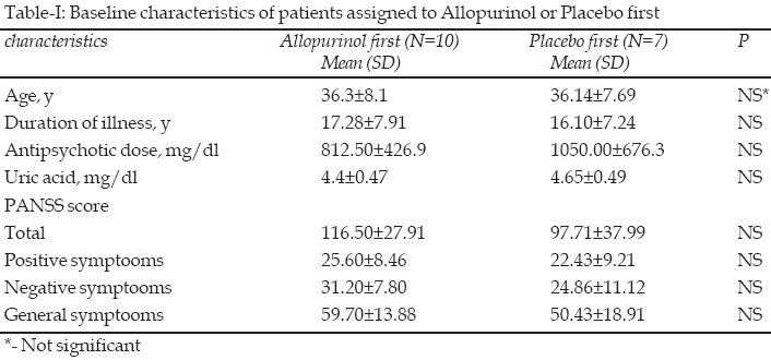 Nineteen patients were studied. Two of patients starting on placebo were excluded from the study, one of them in intervention phase because of loss of consciousness though its relation to allopurinol was not proved. The other was excluded due to the request of the patient’s family. We followed up 17 patients until the end of the study.