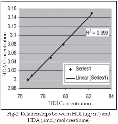 13-15There is a strong relationship between HDI and HDA (Fig-2). The regression statistical test was carried out for significant relationship between HDI air samples and urine samples from workers.