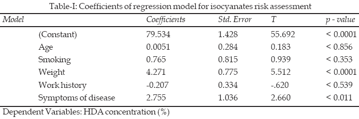 Regression tool was used to assess risk assessment for polyurethane factories. Data was obtained through questionnaires for health surveillance in relation to isocyanates. Health surveillance assessment was extended to all processes where significant exposure to isocyanates in the form of vapor or aerosol may occur. It was the employee’s responsibility to fill up health surveillance questionnaire. This surveillance questionnaire was carried out under the supervision of an occupational hygienist. Statistical analysis was carried out using one multiple regression model through SPSS for both air and urine data.
