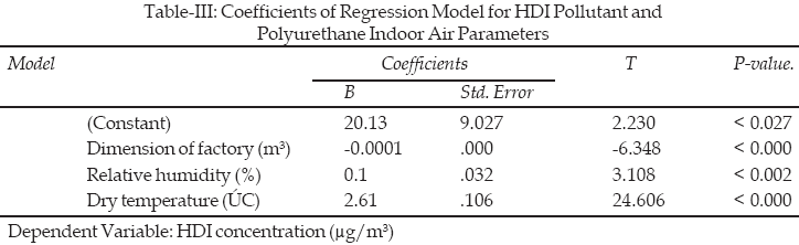 A multiple regression model obtained from analysis of indoor air pollution factors and HDI pollution implies that there is a relationship between the increase of HDI concentration and psychrometric parameters. Based on Table-IV this prediction model at á level of .001 is significant for all of the parameters (p <.0001).