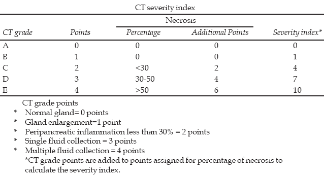 10 Intravenous contrast enhanced abdominal CT scan was performed to assess the status of pancreas and to calculate CTSI in these patients. The CTSI was calculated from the extent of pancreatic inflammation, necrosis and the presence or absence of fluid collections. In the present study twenty nine (58%) patients had CTSI of two points, eighteen (36%) had three points and three (6%) had four points.Endoscopic retrograde cholangiopancreato-graphy (ERCP) was performed in 15 (30%) patients with clinical and laboratory evidence of jaundice or ultrasonographic or CT scan evidence of CBD stones. No stone was detected in the CBD in five patients, in remaining ten patients, endoscopic sphincterotomy was performed for removal of CBD stones after which jaundice relieved and patients improved gradually.