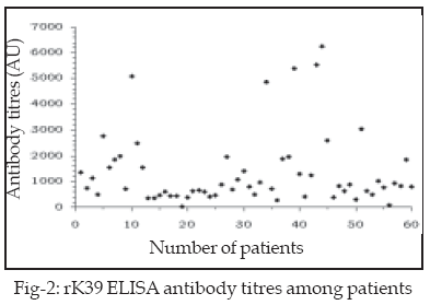 rK39- ELISA for the detection of anti-leishmanial antibodies in plasma: ELISA was performed using ELx 808 Microplate Reader and automatic washer (Bio-Tek Instruments, Inc, USA) for all 60 patients and 40 controls according to the standard protocol of rK39 ELISA for Leishmania.17 The cut-off value of ELISA for antibody concentration was taken as 60AU (Arbitrary Unit). Any value above 60 AU was considered as positive for ELISA (Fig-2&3).