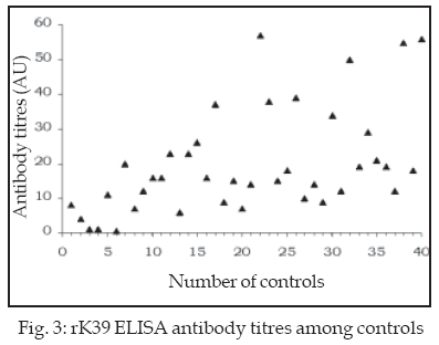 Antibody titres of 60 AU (Arbitrary unit) were taken as cut-off value for ELISA and titres above 60 AU were considered as positive scores. Among 58 ELISA positive cases, 35 (60.34%) had titres within 1000 AU, and 23 (39.66%) had above 1000 AU (Fig-2). While antibody titres of all controls were found below the cut-off value of 60 AU (Fig-3).