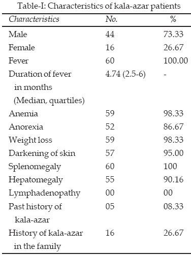 Patient’s characteristics: Forty four were male and 16 were female. Median age of the patients was 25 years with quartile 14-35. All patients had splenomegaly and chronic fever with a median duration of four months. Other common symptoms such as history of weight loss and darkening of skin were found in 98.33% and 95% of the patients respectively (Table-I).