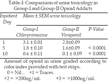 6,8,9,18,19 The quantity of opioid in the urine was graded between 0-3 point ranges (Table-I). All patients had a bed rest on 2nd and 3rd day of hospitalization. Afterward from day 3 to day 9 the patients of group-I and group-II received 50mg of chlorpromazine and 40mg of Verapamil orally three times a day respectively. All patients were discharged from hospital on day 10 of study, when they were experiencing clinically negligible or no withdrawal symptoms.Statistical Analysis: