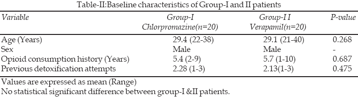 The fundamental characteristics of all patients in both groups were similar (Table-II). All had subjective symptoms of opioid withdrawal and urine samples showing positive outcome when tested with front line opiates dipsticks. Patients on chlorpromazine therapy experienced adverse effects and rate of recurrence of observed side effects were (45%). The experiential adverse effects were dryness of mouth (20%); blurred vision (5%), headache (10%) and postural hypotension (10%). At the same time symptomatic management like Aspirin 300mg three times a day for muscle ache, Diazepam 5mg for nocturnal sedation, Hyoscine 10mg three times a day for abdominal discomfort and Phenargon 10mg three times a day for nausea and vomiting were given to group-I & group-II patients on 3rd,4th,5th and 6th admission day.