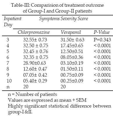 17 and looking for inpatient opioid abstinence management were enrolled in study. All the patients were admitted to the inpatient psychiatry wards for ten days. All those patients were excluded from study that had a prior history of major psychiatric complaint, existing addiction on alcohol or dependence on other drugs of abuse like hypnotics, heart and hepatic diseases. All patients included in the study were male and wished-for holding up the use of opioidsStudy design: Patients were randomly separated into two groups; group I (n=20) received Chlorpromazine; group II (n=20) received Verapamil. They were observed and rated for the existence or nonexistence of opioid abstinence symptoms expressed prior 24 hours by an observer. From day two of hospitalization, until discharge, an observer finished the opiate withdrawal questionnaire (OWQ), which contains 20 distinctive withdrawal symptoms, like, muscle cramps, flushing, joint pain, yawing, impatience, lacrimation, watery nose, chills, unwell stomach, sneezing, abdominal cramps, tetchiness, back pain, perspiration, dejected, insomnia, insecure, hot or cold flashes, irritable to noise, damp and clammy skin. Participants pointed out the extent to which they had practiced every symptom and then observer graded the intensity of the symptoms between 0- no symptom, 1- slight, 2- moderate, 3- quite a bit & 4- tremendous symptoms. The combined score for subject reported symptoms was obtained by totaling the scores of the individual symptoms simultaneously.