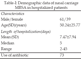 38 (38.0%) were positive for S. aureus nasal carriage (including 18 Methicillin-sensitive Staphylococcus aureus (MSSA) and 20 MRSA). The patient’s demographic characteristics are shown in Table-I.