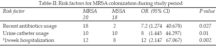 There were no significant association with MRSA carriage (P > 0.05) according to sex, and history of cardiopulmonary diseases, and recent corticosteroids administration. The risk factors for MRSA colonization during surveillance period are shown in Table-II. MRSA colonization according to sex and mean of age of hospitalized patients are shown in Table-III.