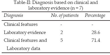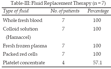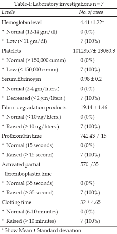 The diagnosis of DIC was based on clinical features and laboratory data (Table-I). Two patient (28.6%) were diagnosed only on laboratory evidence and 5 (71.4%) were diagnosed on clinical features and laboratory data as well (Table-II). All seven cases had low hemoglobin (<11gm/dl) with the average of 4.41gm/dl. Raised fibrin degradation products, clotting, prothrombin, activated partial thromboplastin time and decreased serum fibrinogen and platelets were distinguished laboratory reports. All the seven patients were managed with fluid replacement therapy. Whole fresh blood, colloid solution, fresh frozen plasma, packed red cells was given to all seven patients and four patients received platelet concentrate (Table-III).