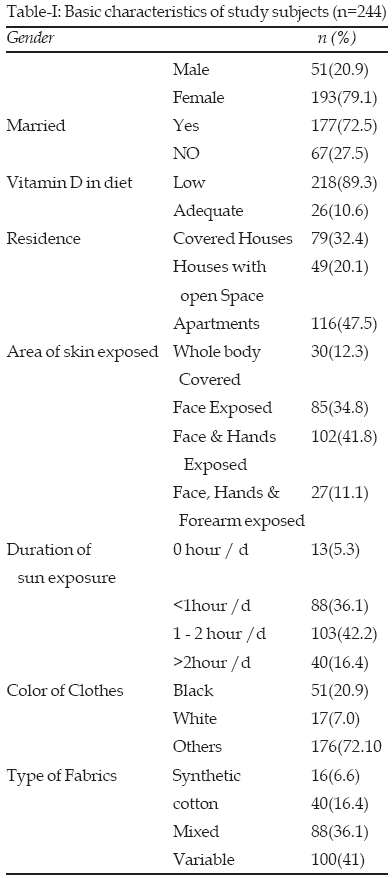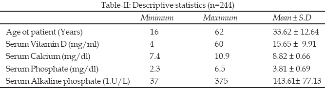 Methodology: In this study 244 healthy adults 16-62 years of age, visited hospital as an attendant of the patients and fulfilled the inclusion and exclusion criteria has been enrolled. After taking written consent a questionnaire regarding age, gender, occupation, duration of sun exposure, area of skin exposed, type of residence used, clothing and dietary habits were recorded. Serum 25-OH Vitamin D3 levels were determined by electrochemiluminescence method and Vitamin D deficiency was defined as a level <20µg/ml. serum calcium. Phosphorus and Alkaline Phosphatase were also measured in all of these subjects.