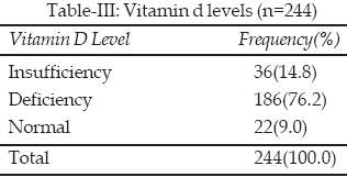 Subjects ranged in age from16-62 years with a mean of 33.62±12.64 years. Among 244 subjects 193(79%) were female. Subjects predominantly were married 177(72.5%), mostly residing in apartments (47.5%) and when outdoor most of them only exposed hands and face (41.8%). Duration of sun exposure in majority was 1-2 hours (42%). Majority of subjects used clothes of variable fabrics (41%) with variable colors (72%).Regarding dietary habits most of the participants consumed food poor in vitamin D content 218(89.3%) whereas 26(10.7%) subjects had adequate amount of food rich in vitamin D content. One hundred eighty six (76.2%) subjects of the study population had deficiency of vitamin D (<20ng), 36 (14.8%) has insufficiency (>20<30) and 22 (9%) has normal level of vitamin D (Table-III).
