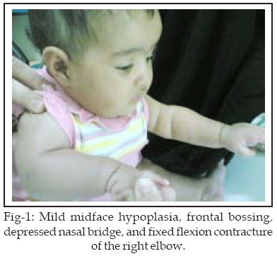 5 Here we report a female patient with skeletal features of ABS and sort term result of radio humeral synostosis resection in that patient.Case History: A nine month old girl, born to a 23- year-old primigravida mother, presented with flexion contracture of right elbow. Her general health was good. The parents were unrelated and family history was not contributory. The pregnancy was uneventful and the baby was a product of normal vaginal delivery at 38th week of gestation. On physical examination, there was evidence of mild brachycephaly (cephalic index: 82), mild midface hypoplasia, frontal bossing and depressed nasal bridge, (Fig-1,2).