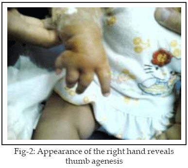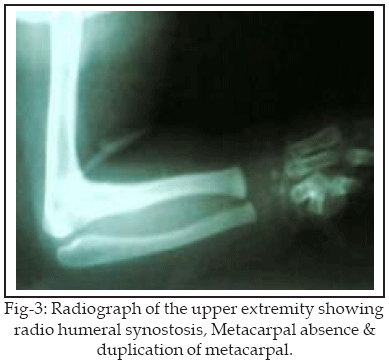 Examination of limbs revealed fixed 90 deg flexion contracture of the right elbow and absence of the thumb. Radiographs confirmed right radio humeral synostosis and skeletal abnormality of right hand including absence of 1st metacarp with hypoplasia and fusion of the 4 th-5th metacarp. (Fig-2,3).