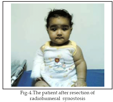 Skull X-Ray and computed tomographic scans confirmed synostosis of both coronal sutures. Sonography of abdominal pelvic and echocardiography was unremarkable. Following a routine pediatrician and preanaesthetic evaluation, she was brought to the operating room. Under general anesthesia with lateral approach, resection of radio humeral synostosis and interposition of local soft tissue was performed. Full range of motion of elbow was achieved (Fig-3,4). A posterior splint was applied and physiotherapy was initiated. The range of elbow and forearm motion was normal in follow up visit at 18 months after surgery.