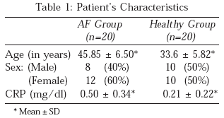 16-18. The statistically significant difference in age between the two groups (p=0.0003) reflects the increasing frequency of AF with increasing age. This is also in line with Framingham study2.We report the association of paroxysmal lone atrial fibrillation, with elevated CRP, a marker of systemic inflammation. These results suggest that the elevated CRP may be related to the burden of atrial fibrillation. CRP was statistically significantly elevated in patients with lone atrial fibrillation in the absence of structural heart disease when compared with healthy subjects (p=0.0037). However, whether CRP elevation is a consequence rather than a cause of atrial fibrillation cannot be determined by these results.