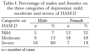 Results indicate that 54 (77 %) males and 7 (19 %) female scored higher (26 and above) on HAM-D, whereas 11 (16 %) male and 18 (49 %) female falls in the category of moderate depression and 5 (7 %) male and 12 (32 %) female falls in the category of mild depression on HAM-D. This indicates that majority (80 %) males were having severe depression and majority (49 %) females were having moderate depression. This shows that males are more depressed than females.