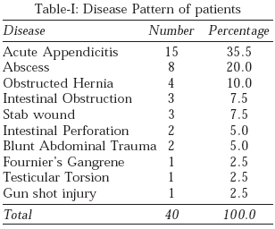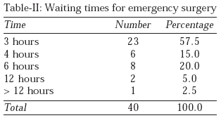 A total of 47 patients were admitted through casualty during the study period. Forty patients who fulfilled the inclusion criteria were enrolled. Diagnosis of all patients are shown in Table-I. Seventeen (42.5%) patients had to wait for more than 3 hours for surgery as compared to 73.3% in the previous audit. In this study 15% waited for 4 hours, 20% for 6 hours and only one patient waited for more than 12 hours. In the previous study 17.7% waited for 4 hours, 33.3% for 6 hours and 6.6% of patients waited for more than 12 hours.