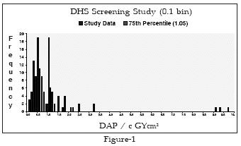 st December 2002 and the 6th July 2003, at Darenth Valley Hospital, Dartford, under going dynamic hip screw fixation for proximal femur fractures was carried out. The data was collected from the Radiographer’s log. The screening time and Dose Area Product (DAP) for each event was analyzed in conjunction with the Radiation Protection Department at Kings College, London. Taking the 75th percentile from the existing data, the DAP was set at 1.05c Gy/cm2. (Fig-1 )