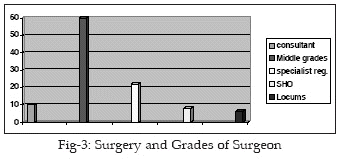 In the total of 112 patients, there were 32 males and 80 females. The age range was from 27 to 99 years with a mean of 83.96 years. Sixty fractures were on the right side and 52 on the left. The breakdown of different grades of surgeons performing the procedures is shown in Fig-3.