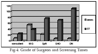 By the same process the screening time for the procedure was set at 64.2 seconds (Fig-2). An audit to access the performance of the orthopaedic department against these standards was carried out. All grades of surgeon performing this procedure were included in the audit.