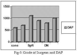 6 The DAP recommended as DRL in our study did not follow the methods recommended by the DRL review committee, as various factors, like weight and thigh size of patient were not taken into consideration. This was because of the general condition and old age of the patients undergoing such procedures. It was felt that this will add little to the existing data and an DRL was set as a guidance to aim for and not as a limit. The results from our study suggests, that on average the DAP, as well as screening times were well below those recommended.The DAP for specialist registrars in training at our hospital was above the recommended level and the speculation was that this might be due to the new environment as the SpR’s hospital frequently during their rotation. Other reasons may include, striving for perfection, size of patient, experience of radiologist and difficulty of cases.