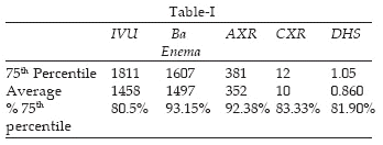 The results were then compared to 100 consecutive IVUs and Barium enemas and 250 consecutive abdominal and chest x-rays performed at our hospital with available DAP data. (Table-I)