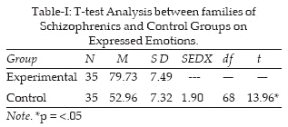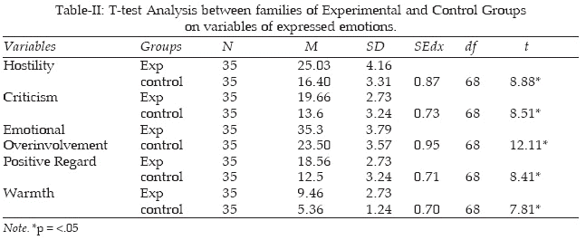 Sample and Setting: A sample of 35 families was selected by using non-probability sampling technique. It was hypothesized that there would be significant difference in expressed emotion among families of patients with schizophrenia and families of normal subjects.