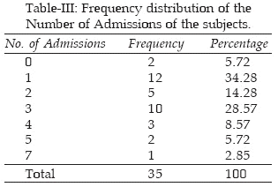 The descriptive analysis in Table-III shows that for most of the subjects this was the first psychiatric admission (34.28%) and there is 2.85% subject in the category of seven admissions.