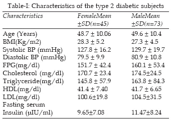 6 In most reports, type 2 diabetic subjects are insulin resistant.7,8 An association of insulin resistance with hypertension and dyslipidemia was also found in type 2 diabetic subjects.9 Dyslipidemia (increased triglyceride and decreased HDL cholesterol levels) has also been associated with insulin resistance in type 2 diabetic subjects.10,11Relatively little data is available regarding the assessment of insulin resistance in type 2 diabetic Pakistani subjects. Metabolic syndrome was assessed in type 2 diabetic subjects and in one study obesity has been seen in 72.6%, hypertension in 42.8% while dyslipidemia was seen in 68.5% of the subjects. The metabolic syndrome was observed in 20.7% of the total subjects.