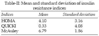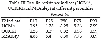 Statistical analysis: All statistical analyses were performed using the statistical program SPSS (version 11). Mean and standard deviations of continuous variables were calculated. Percentiles of insulin resistance indices were also reported. The correlations were seen by applying Pearson’s correlation coefficient. Statistical significance was assessed by using p value <0.05.