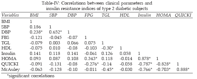 Table-IV shows the correlation between clinical parameters of metabolic syndrome and insulin resistance indices in type 2 diabetic subjects. None of the clinical parameters of metabolic syndrome (BMI, blood pressure, HDL and triglyceride) had significant correlation with fasting insulin resistance indices (HOMA, QUICKI and McAuley) in our study. Insulin resistance indices i.e. HOMA QUICKI and McAuley have strong and significant correlations in between them. There was a strong positive correlation QUICKI and McAuley (r=0.888), but an inverse relationship of HOMA was seen with both QUICKI (r= -0.828) and McAuley (r= -0.703).