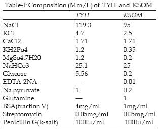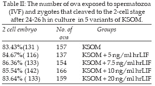 Culture media: Modified KRB (12) called TYH (Table-I) without LIF was used for sperm preincubation and TYH medium with different concentrations (0, 5, 7.5, 10 and 20ng/ml) of LIF for IVF. Pyruvate and LIF was added immediately after overnight equilibration of the medium. Invitro fertilized zygotes were cultured in KSOM (Table-I) suplemented with MEM essential amino acid solution (Sig. M-5550) (10ìl/ml) and MEM non-essential amino acid solution (Sig. M-7145) (5ìl/ml). Glutamine (Sig. G-5440), pyruvate (Sig. P-5280), BSA and aminoacid solution and LIF were added.
