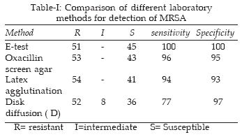 By using E-test method, of 96 isolates 51 isolates were MRSA and 45 isolates susceptible to methicillin. Oxacillin screen agar showed only two false positive MRSA in comparison with E-test .The sensitivity and specificity of oxacillin screen agar methods was 96% and 95% respectively in comparison with E-test. The MRSA –Screen latex agglutination showed 54 (three false positive) MRSA isolates and 42 isolate were susceptible to methicillin. The sensitivity and specificity for this method was 94% and 93% respectively. Table-I