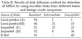 The results of susceptibility testing by disk diffusion method was very conflicting. Of 96 tested strains of S. aureus by using local product oxacillin disks from Company A(Iran Daru, Iran), 94 (98%) isolates were MRSA. There were only two strains intermediate. By using the other local oxacillin disks from company B (Pad Tan, Iran) 60 strains were MRSA, 21 strains intermediate and 15 strains susceptible to methicillin. .Results of disk diffusion method by using imported product disks; in comparison with local product oxacillin disks were better. For example by using imported oxaacillin disk company C (Hi Media India) 52 strains were MRSA, 22 strains, intermediate and 22 strains susceptible to methicillin. Finally results of disk diffusion method by using other imported oxacillin disks company D (Becton, Dickinson and Company USA) were similar like other conventional methods such as oxacillin screen agar. By using these oxacillin disks 52 strains were MRSA, 8 strains intermediate and 36 strains susceptible to methicillin. Table-II summarizes results of disk diffusion methods by using oxacillin disks from four different companies for detection of MRSA.