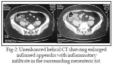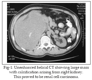 The detection of renal cell carcinoma was unusual, not describe in other studies (Fig-1). The urinary abnormalities described in other studies8,9 include crossed fused ectopia, horse shoe kidneys, adult poly cystic kidney disease, acute pyelonephritis, pyonephrosis, xanthogranulo- matous pyelonephritis, and ureteral obstruction from non calculus causes, cystitis. These urinary causes have most of the times more serious consequences than urolithiasis alone and many of these require more urgent therapy. While CT is limited with regard to detection of pyelonephritis, the diagnosis can be suggested if the clinical history is appropriate and findings such as perinephric stranding, renal enlargement and, possibly, hydronephrosis are present. It is also important to document the presence of intra- or extrarenal fluid collections, although the ability to detect intrarenal fluid collections may be very limited. In the appropriate clinical setting of pain without a genitourinary tract explanation, imaging with intravenous contrast material can increase the sensitivity for detection of intrarenal abscess. Indeed, pyelonephritis and its associated secondary complications are not uncommon in patients with obstructing ureteral calculi and may require emergent treatment (i.e., nephrostomy placement). Spontaneous perforation of a ureter, calyceal fornix, pyelocaliceal diverticulum or renal pelvis can occur.8 The kidneys of patients with acute renal infarct secondary to renal arterial occlusion may appear unremarkable during the very early stages on nonenhanced CT images; however, when infarction involves large regions of an involved kidney, the kidney may become enlarged, with preservation of its reniform shape.9 Renal venous thrombosis may manifest on nonenhanced CT images as ipsilateral renal enlargement with edema in the perinephric space.9 A ureteral transitional cell carcinoma, while uncommon, should also be considered, especially if there are signs of chronic obstruction; careful inspection of the ureters may be necessary. Many of these entities may require follow-up imaging with intravenous contrast material to establish a definite diagnosis.