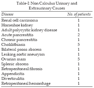 In 23 (23%) patients non calculus causes of pain were diagnosed. In 5 (5%) patients incidental findings were recorded which were most likely not cause of pain. Three patients had non calculus renal abnormalities which included horseshoe kidney, adult polycystic kidney disease and renal cell carcinoma. Extraurinary causes are given in Table-I. Five patients had incidental findings which included ascites in three, hepatic cyst and hemochromatosis in one each.